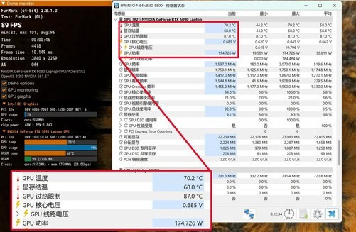 GeForceRTX5090笔记本电脑GPU满功耗为175W,雷蛇灵刃182025自然可以轻松稳定在175W功耗释放,而且GPU平均温度仅为70.2℃,散热系统的效率相当出色。