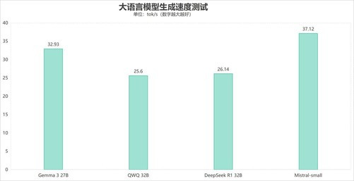 这里我们选择了Gemma327B、QWQ32B、DeepSeek-R1DistillQwen32B以及Mistral-small24B四个常用大语言模型,生产速度分别达到了32.93tokens/s,25.6tokens/s,26.14tokens/s以及37.12tokens/s,满足日常使用不成问题。