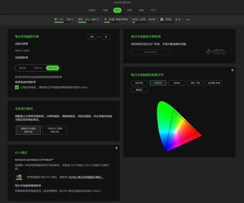 同时,雷蛇灵刃182025在雷云控制中心里的显示菜单中,加入了非常细致的设置选项,可以看到官方提供了Native、DCI-P3等数种颜色配置文件,方便不同用户选择。