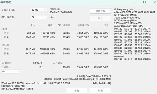单核和多核理论性能了解之后,我们来看看处理器应用方面的性能表现。首先是7-ZIP压缩/解压缩测试,由于取消了超线程,所以酷睿Ultra9275HX处理器的压缩速度只有136770KB/s,不过解压缩速度还是能够达到1965928KB/s,综合评分165.546GIPS,完成10轮压缩/解压缩测试耗时仅为52.937秒,满足日常应用没啥问题。
