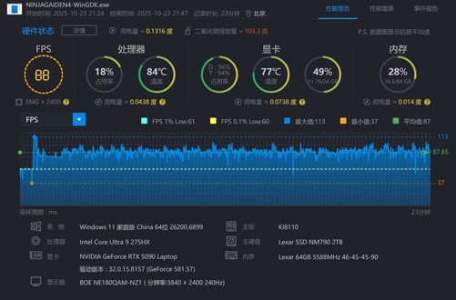 《忍者龙剑传4》是近期新发布的忍龙系列正统续作,在硬核动作基础上简化了操作难度,吸引粉丝的同时也很适合新玩家入坑。在4K分辨率、最高画质、DLSS平衡模式下,实测画面平均流畅度可以达到88fps,另外1%LOW帧也能够达到60fps,流畅无卡顿、无延迟的画面对于这种高速硬核动作游戏来说非常重要。