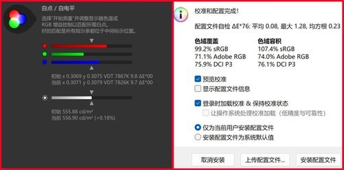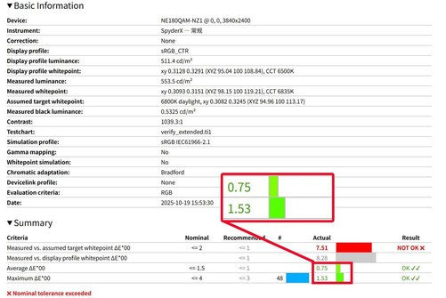 这块屏幕的色准调校也非常出色,平均ΔE值为0.75,最大也只有1.53,色彩偏离度极低,色彩还原精准。
