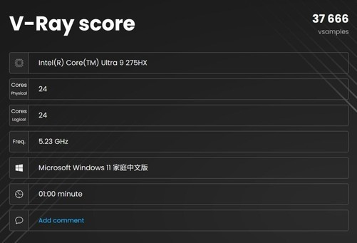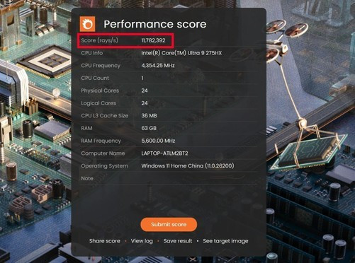 光线渲染方面,我们参考Corona10Benchmark的测试,可以看到酷睿Ultra9275HX每秒可以渲染11782382条光线,效率还是相当可观的。