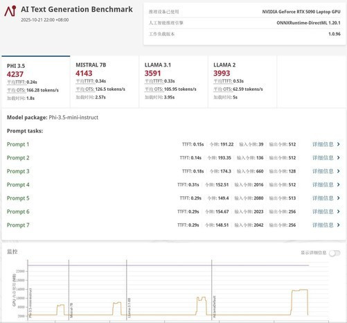AI大语言模型生成速度方面,参考ULProcyon测试可以看到,Phi-3.5mini4B、MISTRAL7B、Llama3.18B、以及Llama213B四种大语言模型的生成速度分别为166.28tokens/s,126.5tokens/s,105.95tokens/s以及62.59tokens/s,中小参数量规模的大语言模型生成速度完全不存在瓶颈。