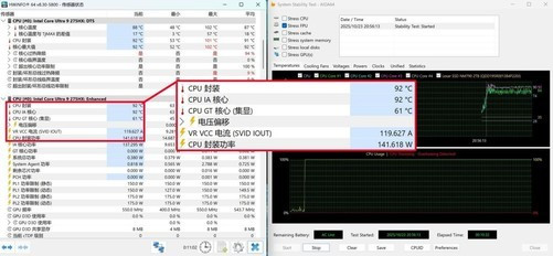 从理论测试和应用测试来看,雷蛇灵刃182025为酷睿Ultra9275HX提供了非常出色的性能释放空间,通过AIDA64FPUCPU单烤机测试可以看到,在高性能模式下,酷睿Ultra9275HX处理器功耗释放可以达到141.618W,而封装温度为92℃,整体表现不错。