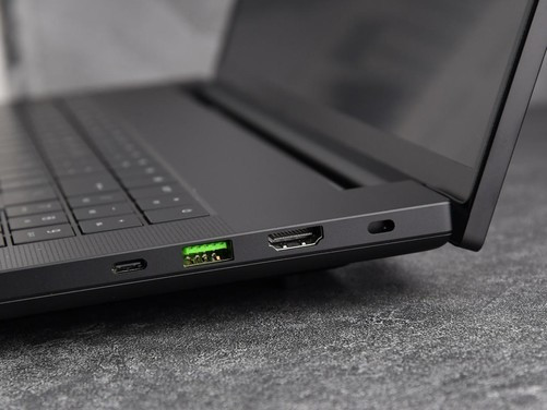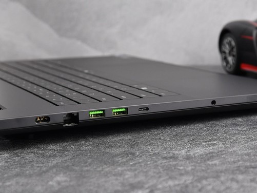 由于采用了内吹散热架构以及下沉式屏轴设计,所以雷蛇灵刃182025机身尾部并未设计接口。其机身右侧配有安全锁孔、HDMI2.1视频输出端口、USB3.2Gen2Type-A接口、雷电5接口(带电源输出)以UHS-IISD读卡器插槽。