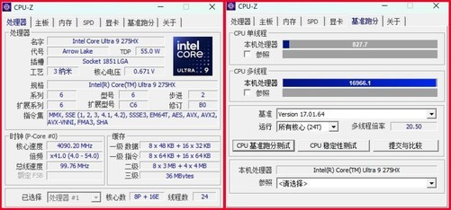 首先来看处理器,雷蛇灵刃182025之所以能够继续保持纤薄设计,与酷睿Ultra200HX系列出色的能效比密切相关。它搭载的酷睿Ultra9275HX采用24核24线程设计,由8个性能核+16个能效核构成,睿频加速频率5.4GHz,拥有36MB三级缓存,默认TDP为55W,最高TDP可以达到160W。CPU-Z单核得分827.7,多核得分16966.1,总体性能释放非常不错。