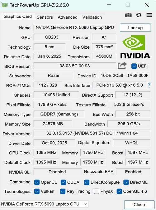 从理论性能测试来看,RTX5090笔记本电脑GPU作为本世代最强移动级显卡,整体性能表现出色,完全能够满足当下3A游戏、AI计算、生产力应用的各种需求。而且雷蛇灵刃182025屏幕最高支持4K分辨率,配合RTX5090笔记本电脑GPU,不仅能够带来流畅的4K游戏体验,更能够为用户提供足够清晰的视觉观感体验。